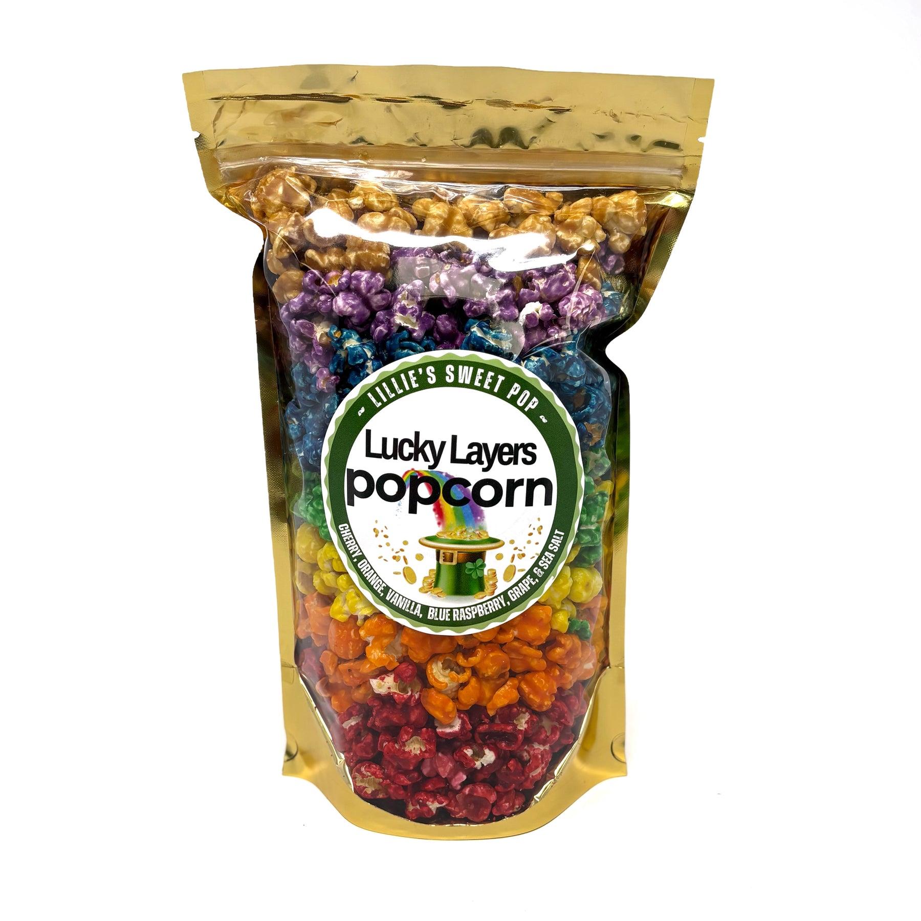 Discover your pot of gold at the end of the rainbow with Lucky Layers St. Paddy's Day Gourmet Popcorn. This festive treat brings the luck of the Irish to your taste buds with eight vibrant, delicious layers inspired by the colors of the rainbow.