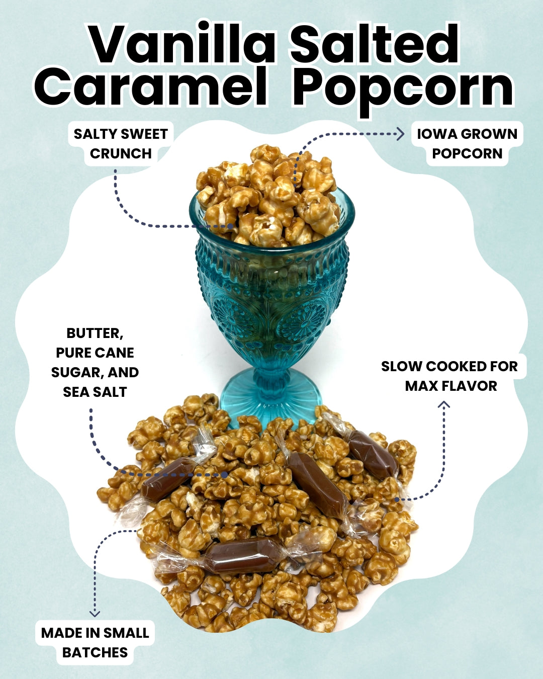 Introducing our savory sensation, Salted Vanilla Caramel Popcorn; an elevated gourmet treat that brings out the best of Iowa’s beloved popcorn! Each fluffy, crunchy kernel is carefully crafted and dusted with just the right amount of sea salt, delivering a satisfyingly salty finish that’s simply irresistible.
